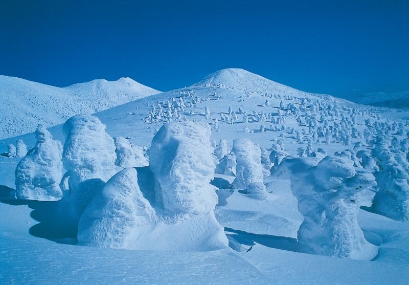 橫跨山形縣和宮城縣的藏王是指位於縣界的藏王連峰周邊區域。作為東北地區最大規模的滑雪度假村而聞名,一到冬天就有很多追求粉雪的國內或海外遊客前來滑雪。藏王以樹冰而聞名。樹冰是指即使在0℃以下也不會結冰,由過冷的水滴構成的濃霧與雲和樹木互相觸撞,所形成的白色冰層現象。在藏王更有機會觀賞這些樹冰長大後,被稱為「雪怪物」和「冰怪物」的景象。即使在東北地區也只能在特定地區才能看到,因此充滿魄力的樹冰原絕對值得一看。