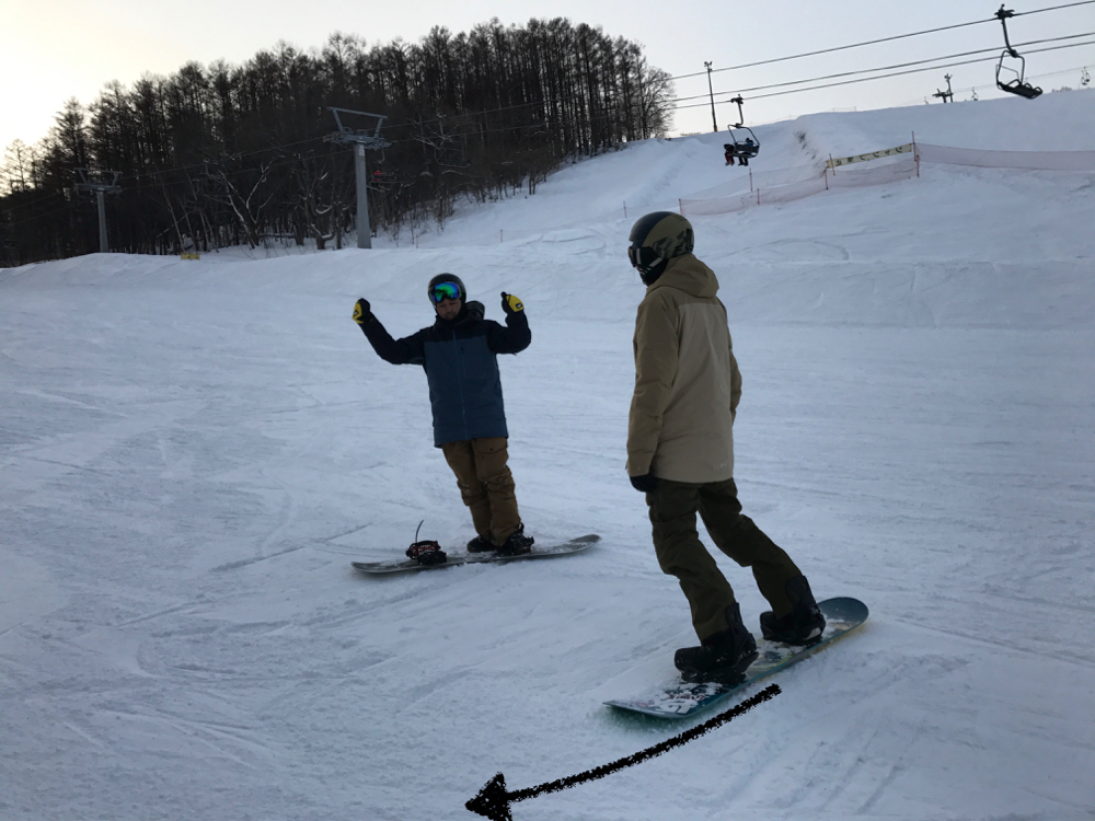 接著就移動到藍色文字所示的正轉位置吧。使用腳尖的邊緣來橫越斜坡。順道一提當要從背轉位置切換成前轉位置的時候,先蹲坐在斜坡然後一氣呵成轉換方向會比較好喔。背對斜坡或許一開始會覺得很可怕,重點在於跟用腳尖側橫向滑行的相同位置處留心用前腳加速。