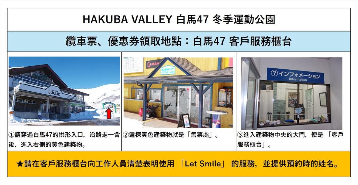 【纜車券、租借兌換券等的領取地點】HAKUBA VALLEY 白馬47 冬季運動公園服務中心櫃檯(說明圖)