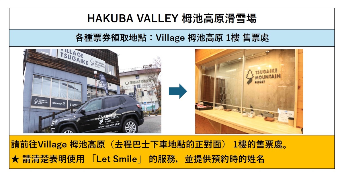 【纜車券、租借優惠券的領取地點】HAKUBA VALLEY 栂池高原滑雪場 Village Tsugaike 1樓 售票中心(說明圖)