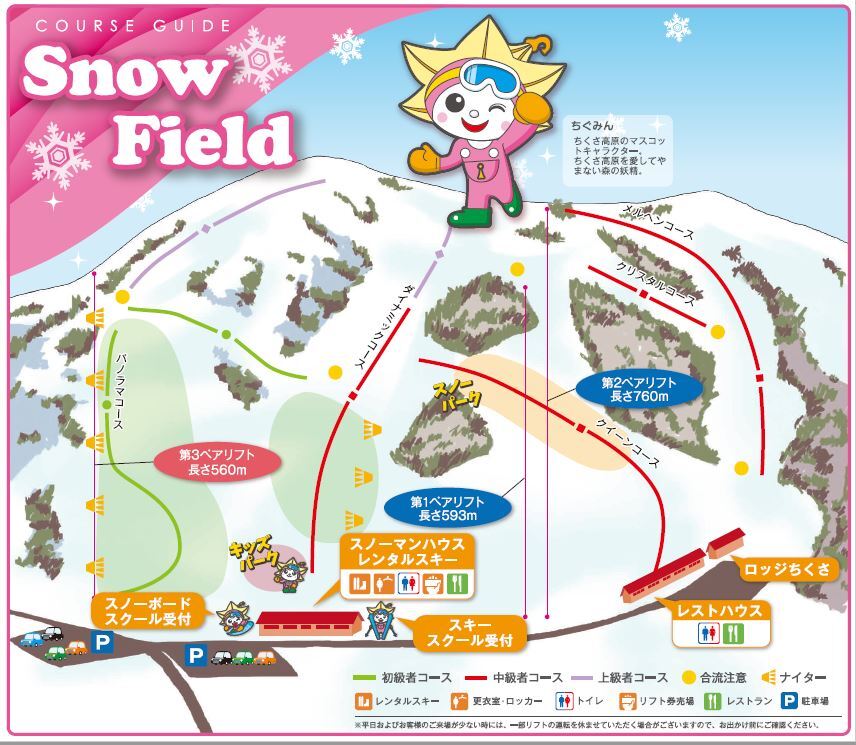 千種高原滑雪場備有人工造雪機,雪量不足時亦可照常營業(造雪機可能因氣溫而無法運作)。設有全景滑雪道、變化多端的滑雪道等,從初級者到高階者都能玩得盡興,還有能讓小朋友開心玩耍的兒童樂園。開放夜間滑雪,夜間營業至21:00或22:30。(具體時間請參考官網)