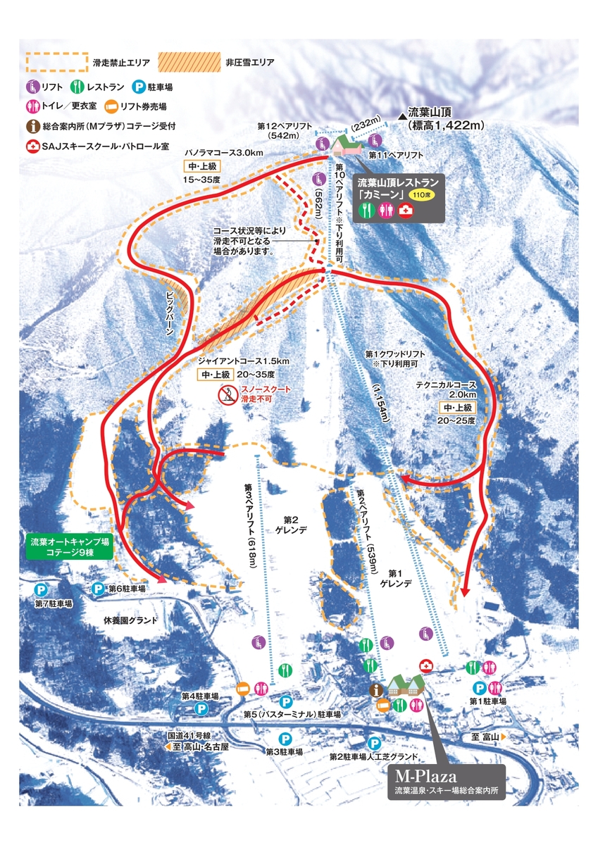這座滑雪場擁有視野開闊的山脊、陡坡以及寬廣緩坡,並提供多樣雪道。無論是初學者、親子同遊或是高階者都能盡情享受滑雪的樂趣。從山頂可360度俯瞰群山帶來的壯麗全景。流葉山背面還藏著一片山毛櫸的林間雪道,吸引許多粉雪和自然地形滑雪愛好者慕名而來。運氣好的話,還有機會看到雲海或樹冰。山頂也有緩坡,讓初學者在滑雪的同時也能欣賞絕景。如果對中高階雪道感到不安,可搭乘纜車下山。另外,也千萬別錯過當地的溫泉和美食喔。