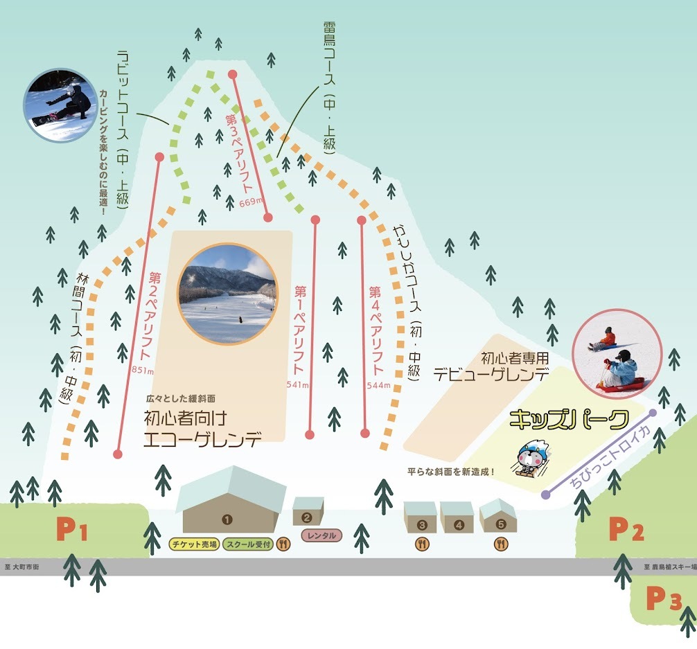 由視野極佳的寬廣緩坡和坡度適中的綿延斜坡的雪道所組成,從初學者到高階者皆能享受滑行樂趣。「兒童滑雪場」佔地遼闊,為小朋友提供安心的戲雪空間。此外,還有超人氣的「兒童電動雪橇」。