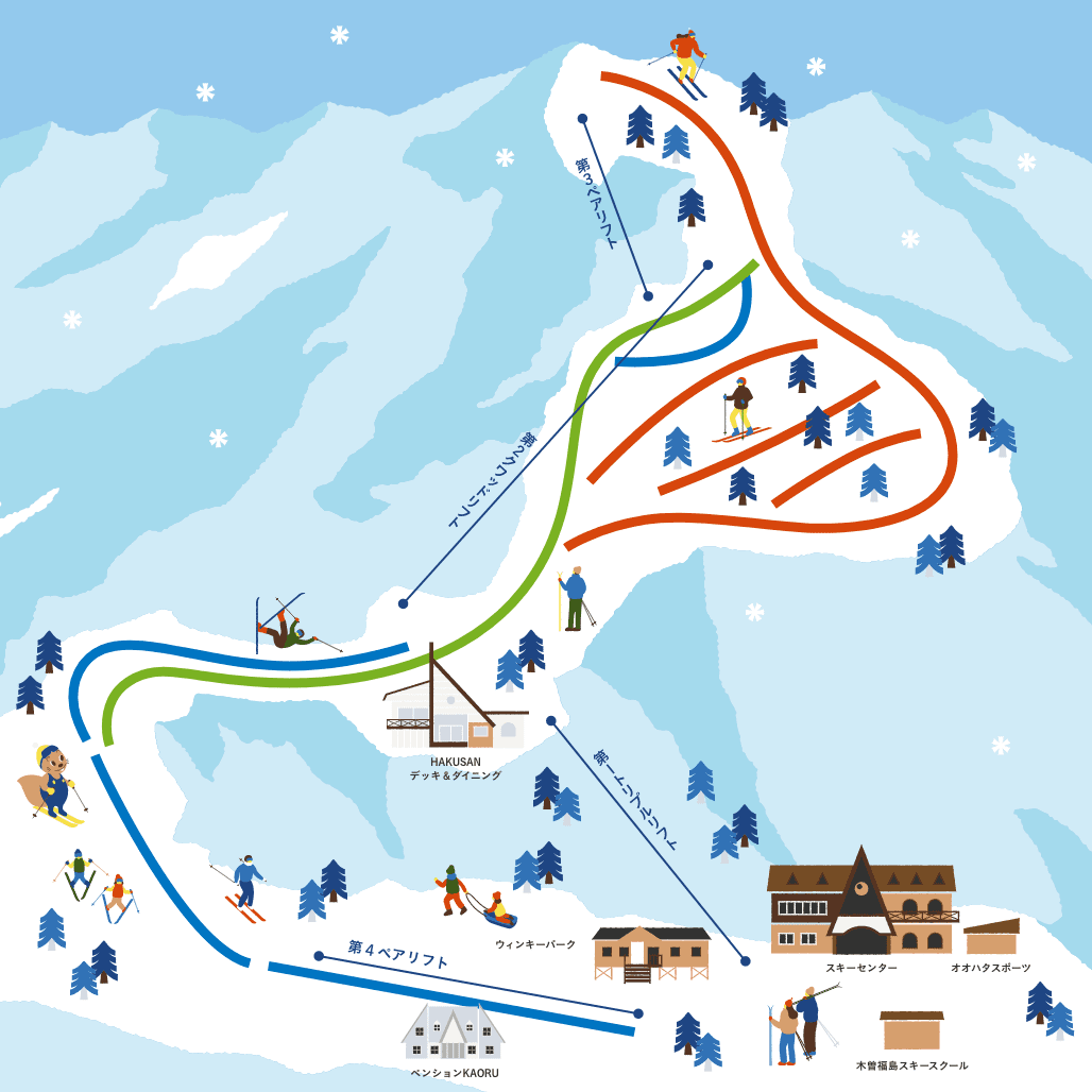 長野縣內首屈一指的雙板滑雪專用滑雪場。海拔1904公尺的滑雪場頂端,設有4600公尺的超長雪道,以及從初學者到高階玩家皆能樂在其中的8條雪道,皆為雙板滑雪者獨享。從滑雪場遠眺,能看見木曾御岳山和信州群山,景色非常壯觀。光是家庭旅客與初學者的雪道就長達2500公尺,還設有兒童樂園,帶小小孩的旅客也能安心暢玩。