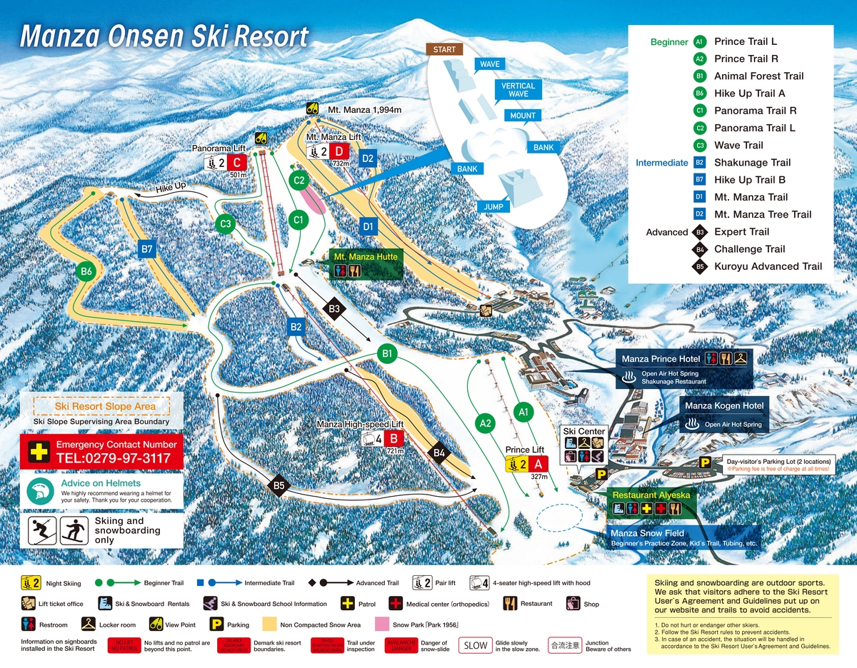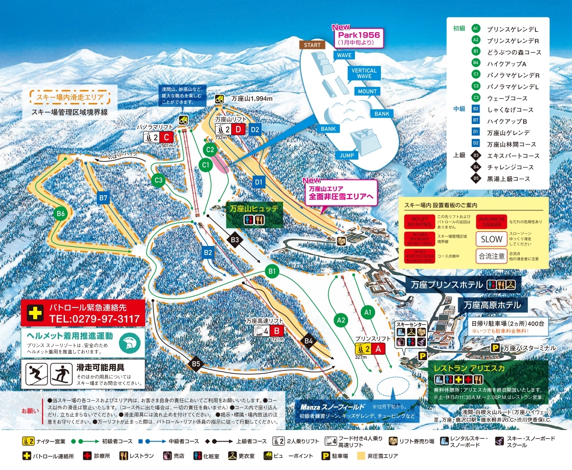 以「粉雪的萬座」之名而廣為人知,除了可在此享受日本國內屈指可數的粉雪樂趣,亦能從海拔1,994米高的山頂看到富士山!滑雪場雖小,但五臟俱全。設有平緩或陡峭的滑雪道、可欣賞到美麗樹冰的林間雪道、能在深厚積雪上滑行的非壓雪區,以及可眺望淺間山及妙高山的全景滑雪道等,選用了無論初學者或高手都能在此享受滑雪的設計。小學生或以下的小童可獲得免費纜車票!動物招牌設計的「動物森林滑雪道」亦很受歡迎。徒步至附設的酒店不需一分鐘,更與日本硫磺含量數一數二的萬座溫泉街相連。