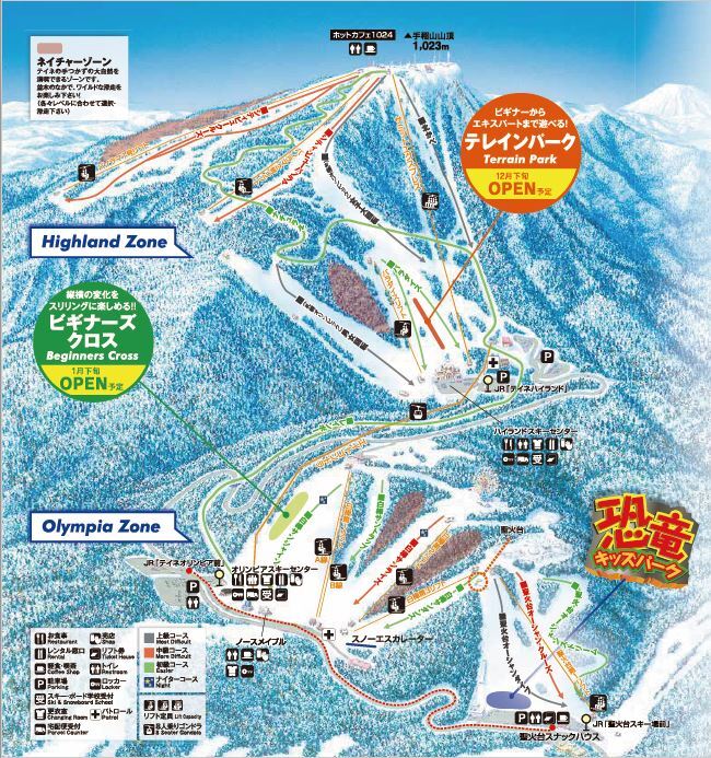 【高地滑雪中心】設有纜車票售票處、餐廳、商店、租借店、速遞服務、投幣式儲物櫃、更衣室,還有托兒所、租借房間。此外,設有可以脫掉雪靴,好好放鬆休息的收費休息區K-Lounge以及會員儲物櫃,是個設施齊全的滑雪中心,並可作為Highland Zone的據點。4樓則是通往滑雪場的出口。【OLYMPIA滑雪中心】設有纜車票售票處、餐廳、商店、租借店,速遞服務、投幣式儲物櫃、更衣室,以及滑雪學校接待處、育嬰室,適合一家大小或滑雪初學者使用。