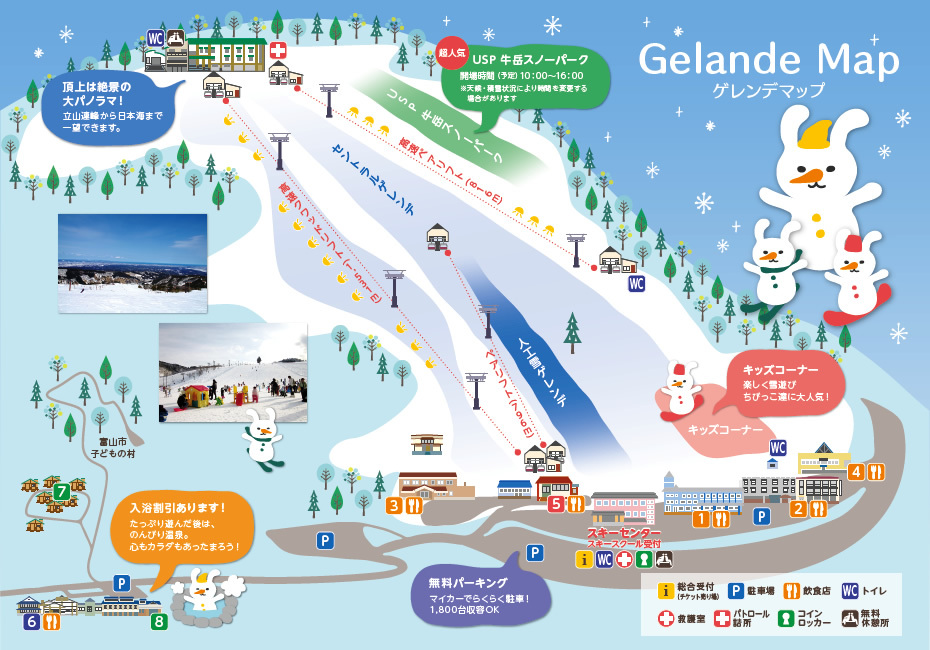 從擁有廣闊的中等緩斜坡滑雪場上面,可以把富山灣、富山平野及立山連峰的美景盡收眼底。天氣晴朗時、晚上的景色絕對是值得一看。